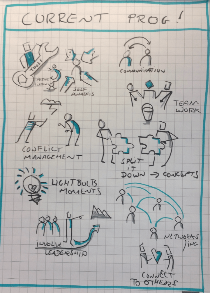 During the meeting I was asked to write up very quickly some feedback from the six client team members about what they liked about their previous leadership programme. I realised that I could carry on the visual theme and so started to make “bikablo” style icons of what they liked. I realised also, as I was doing this that A) They might not recognise the image for what I thought it meant and B) considered that if we needed to refer back, then the words would also help, so I started to add in their words for each visual element. The feedback was positive, but I still wonder if I could have gone beyond visual popcorn in the little time we had.