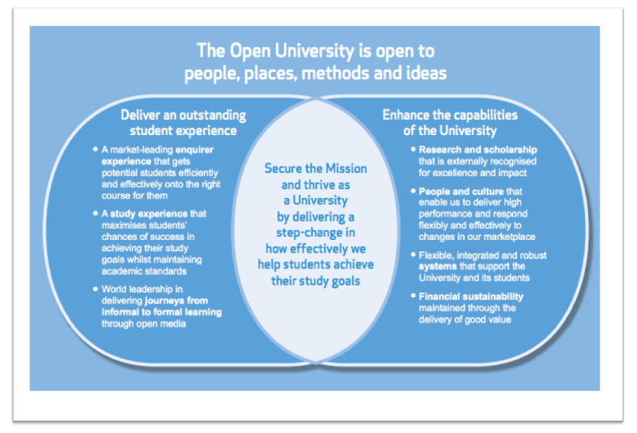 There is formal leadership around innovation with Professor Belinda Tynan holding the role of Pro-Vice-Vice_Chancellor (Learning Innovation). Innovation also features heavily in the strategic plan (up to 2017). The OU values are stated as: