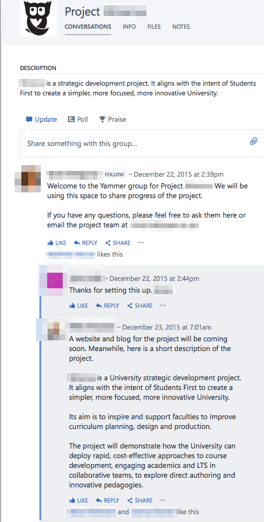 Screen Capture of Yammer Thread on Innovation Project (Project name and people engaged removed for confidentiality reasons)
