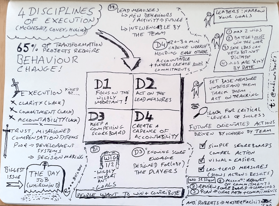 This is another slightly wonky (done on a bumpy flight, like these) sketch note of the 4 Disciplines of Execution. I have done this previously, but wanted to see if my second attempt was better. I am pretty happy with this version. Still need to work on lettering, spacing and images!